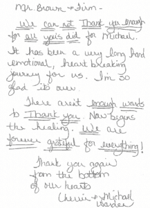 “Our family does not have the words to express our gratitude for all that you have done over the years for our mother, Joyce. Joyce thought the world of you and we hope you know how she and we appreciate you!”